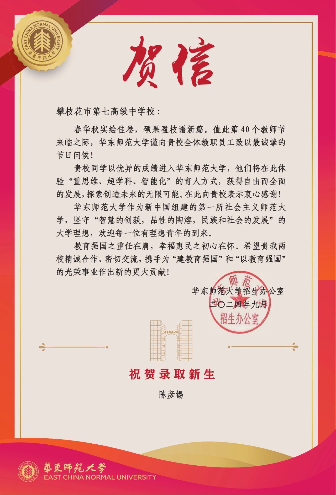 >>华东师范大学发来贺信