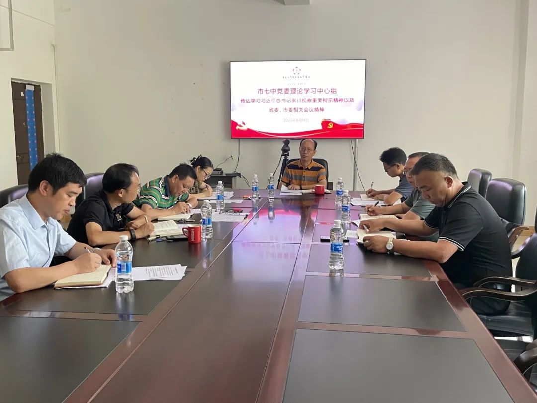 2023年8月14日下午,市七中党委在花城校区3号楼2楼会议室召开理论学习中心组学习会议,传达学习习近平总书记来川视察重要指示精神以及省委、市委相关会议精神。会议由学校党委书记杨鸿主持,全体班子成员参加。