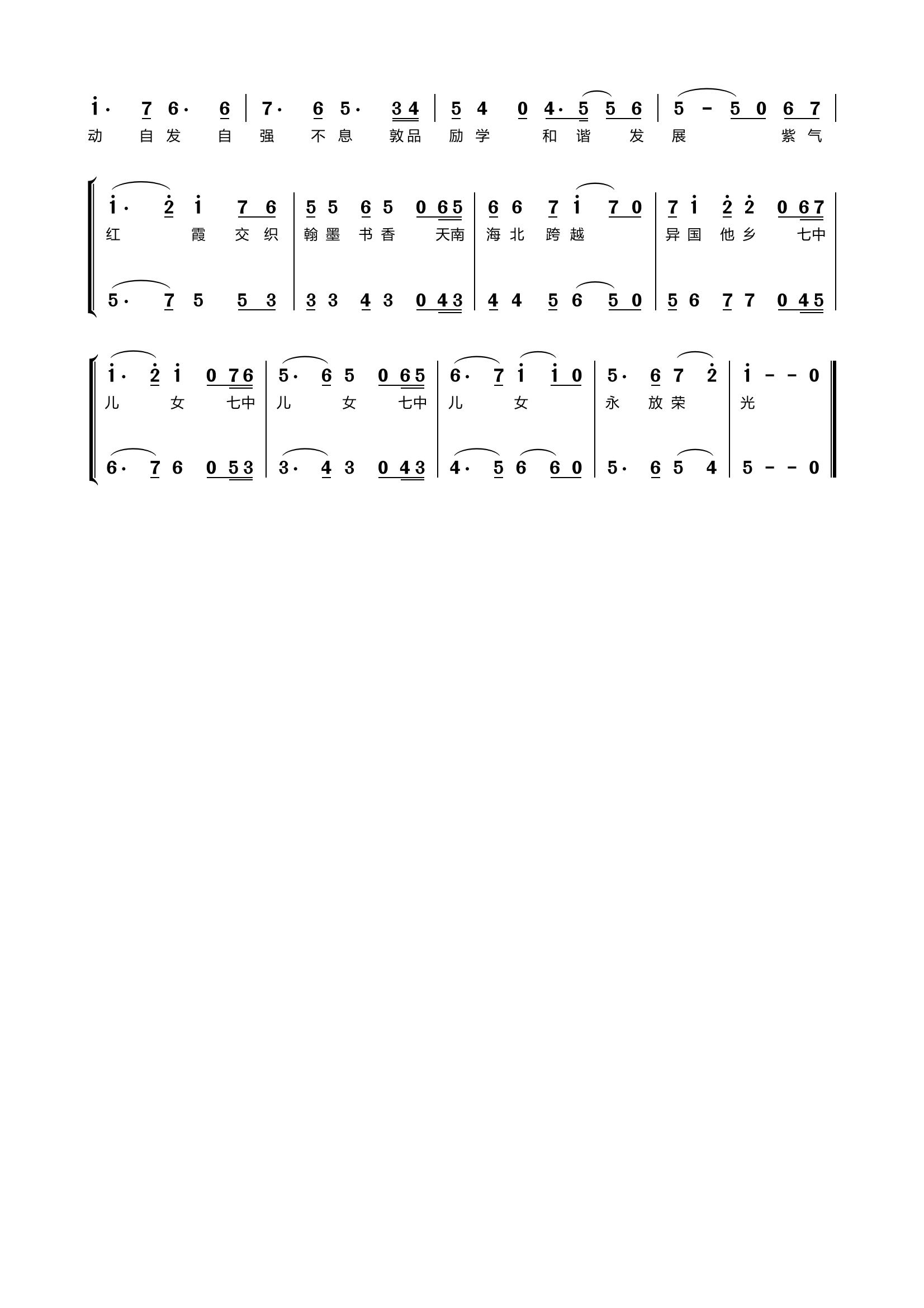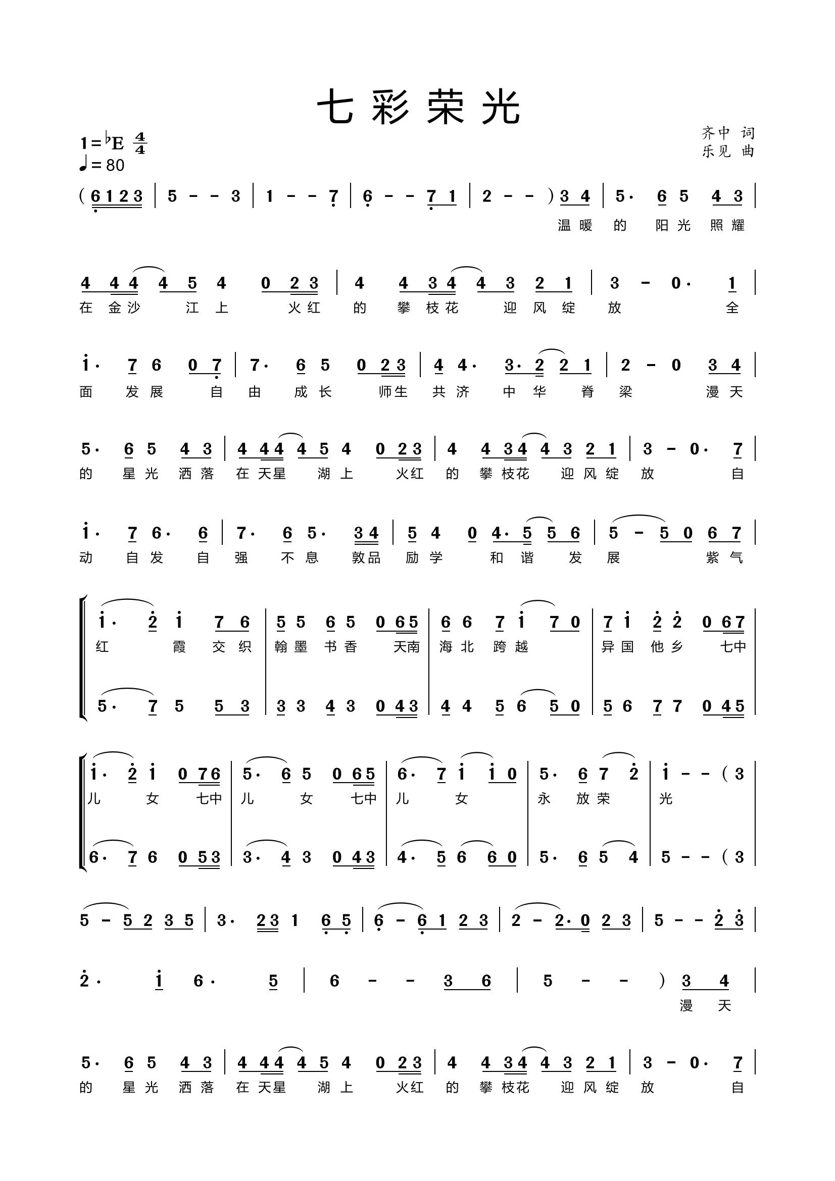 说明:歌词因谱曲和传唱需要,力求押韵,朗朗上口;新版校歌的第一部分,突出学校的整体谋划和“培养全面而自由发展的中华脊梁”这一培养目标;“师生共济”体现师训“在成就学生的同时成就自己”。第二部分,“天星湖”指代花城校区,暗指“一校两区”的办学格局;该部分突出“敦品励学,和谐发展”的办学思想和“自动自发,自强不息”的学校精神。第三部分副歌,强调在一个个努力学习的日子里,七中学子养成了高雅的气质,最后从七中校园走向世界各地;“七中儿女,永放荣光”是对一代代七中师生开拓进取、奋斗不息的礼赞。整首歌歌词简洁,朗朗上口,旋律清新,优美动听,展现了青春校园的美好记忆。