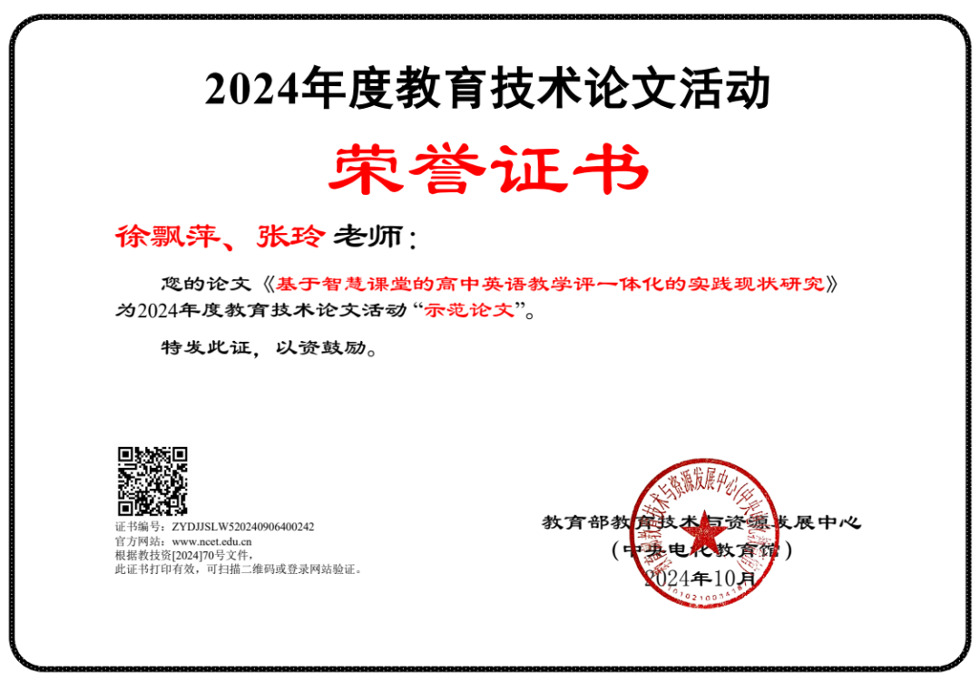 祝贺我校徐飘萍老师和张玲老师的论文《基于智慧课堂的高中英语教学评一体化的实践现状研究》在2024年度教育部教育技术论文活动中被评选为“示范论文”。