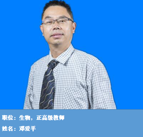 邓爱平,攀枝花市第七高级中学校生物教师,正高级教师,四川省骨干教师,攀枝花高层次人才,攀枝花市有突出贡献专家,攀枝花市学科带头人,攀枝花市普通高中教学能手,多次荣获市、校“优秀教师”“优秀共产党员”称号;多次荣立“教学一等功”;所带班级被评为“市先进集体”、校“优秀班级”;所带备课组多次荣获学校“先进集体”称号。主动投入教研、科研,主持或者主研省级课题两项,并获四川省第三届教育发展改革研究优秀成果一等奖和攀枝花市政府教学成果三等奖;多篇论文发表和获奖并参与多部著作的编写;尽心尽力培养年轻教师,成果显著,培养的徒弟中,李翠兰获得四川省高中生物优质课竞赛二等奖和市一等奖,成长为攀枝花市学术技术带头人后备人选;刘越获得四川省高中生物优质课竞赛省二等奖和市一等奖,成长为攀枝花市普通高中教学能手;朱鹏获得四川省高中生物优质课竞赛二等奖和市一等奖;宋咏、李怡校级赛课获奖并有论文发表。