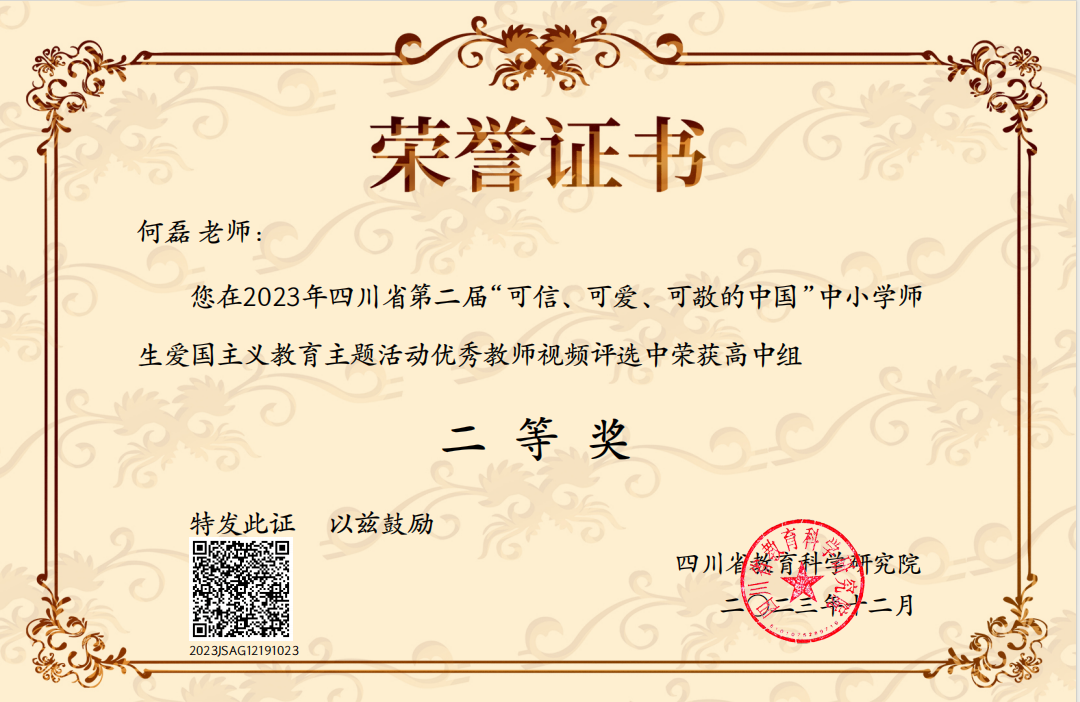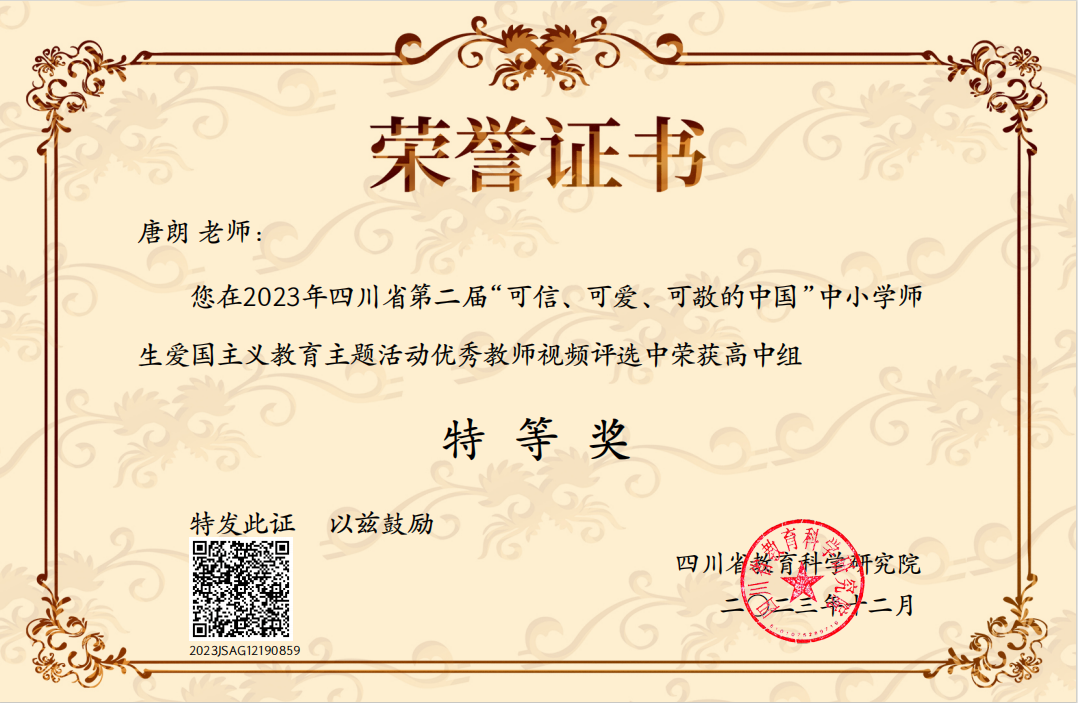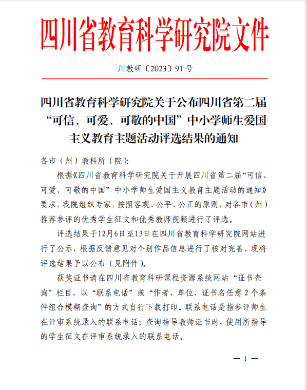 近日,由四川省教育科学研究院举办的四川省第二届“可信、可爱、可敬的中国”中小学师生爱国主义教育主题活动评选结果揭晓,市七中语文教师李占锋、唐朗夺得四川省特等奖!