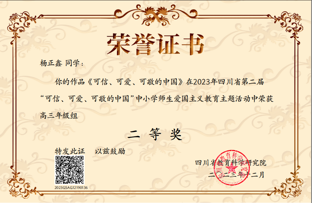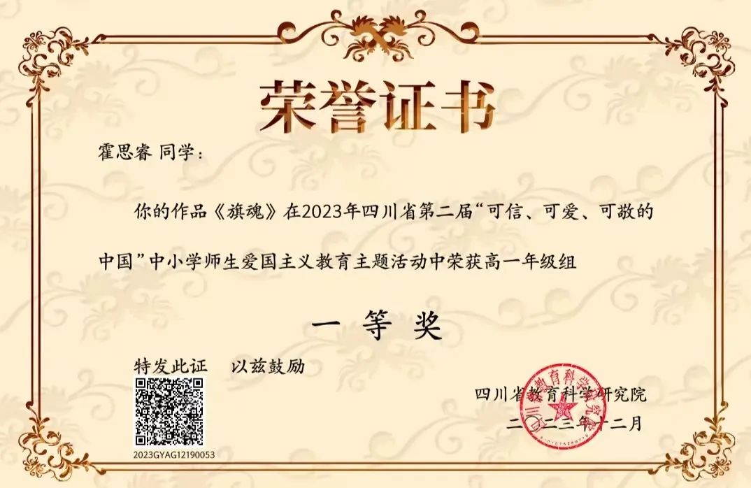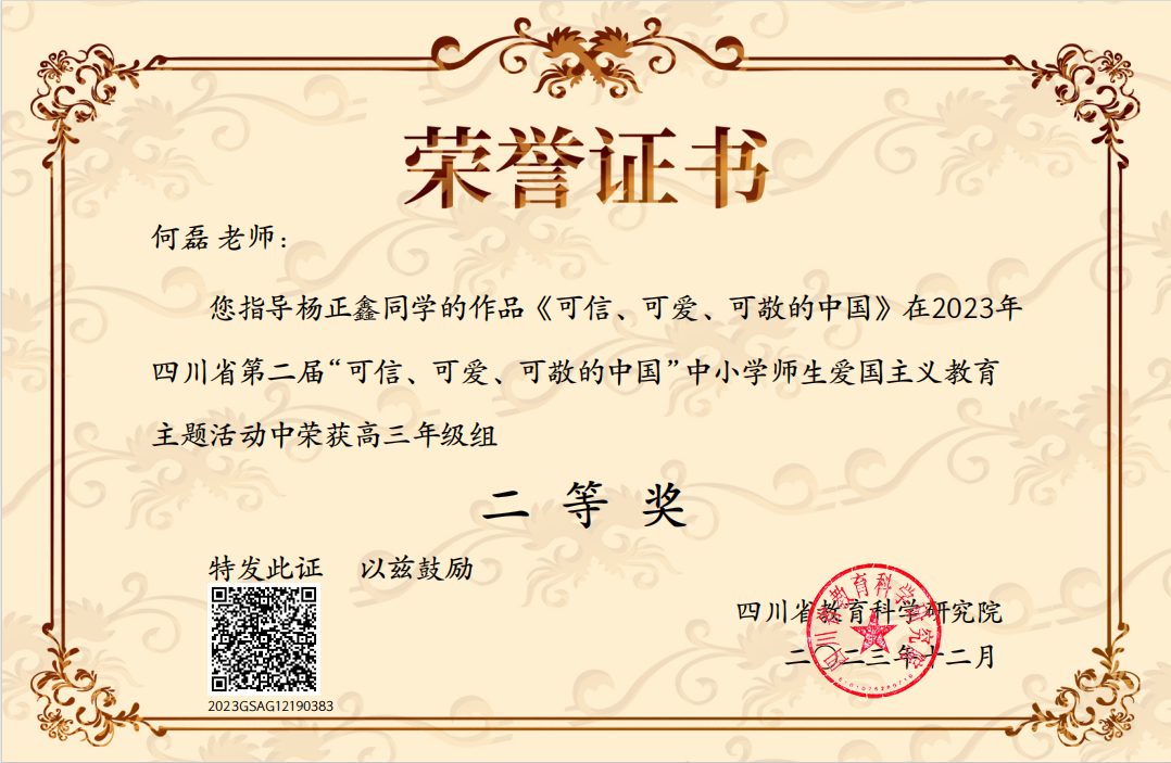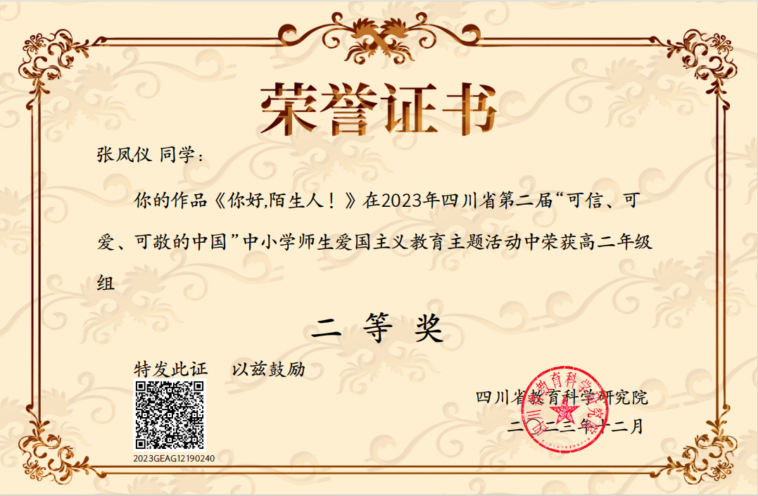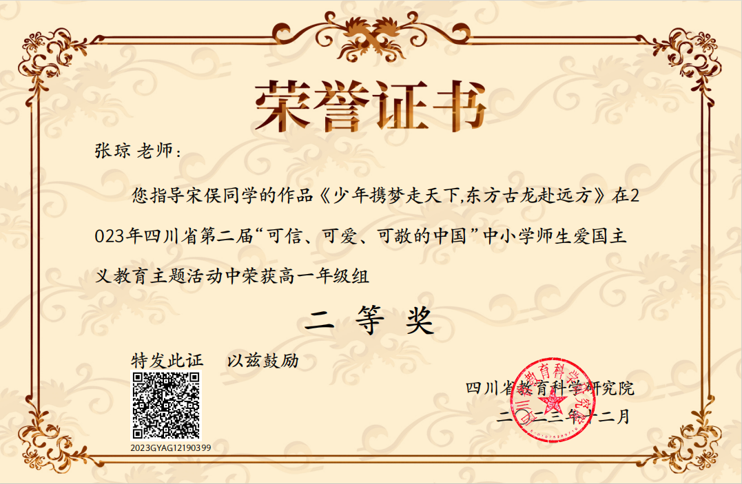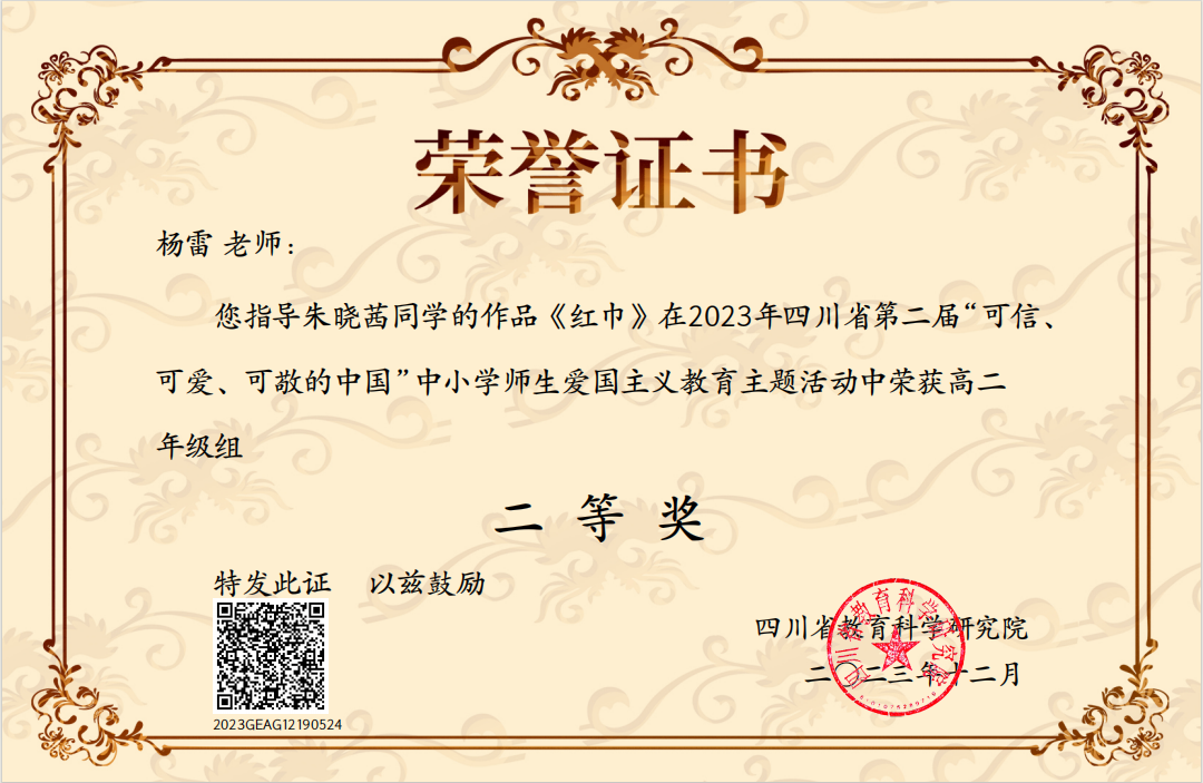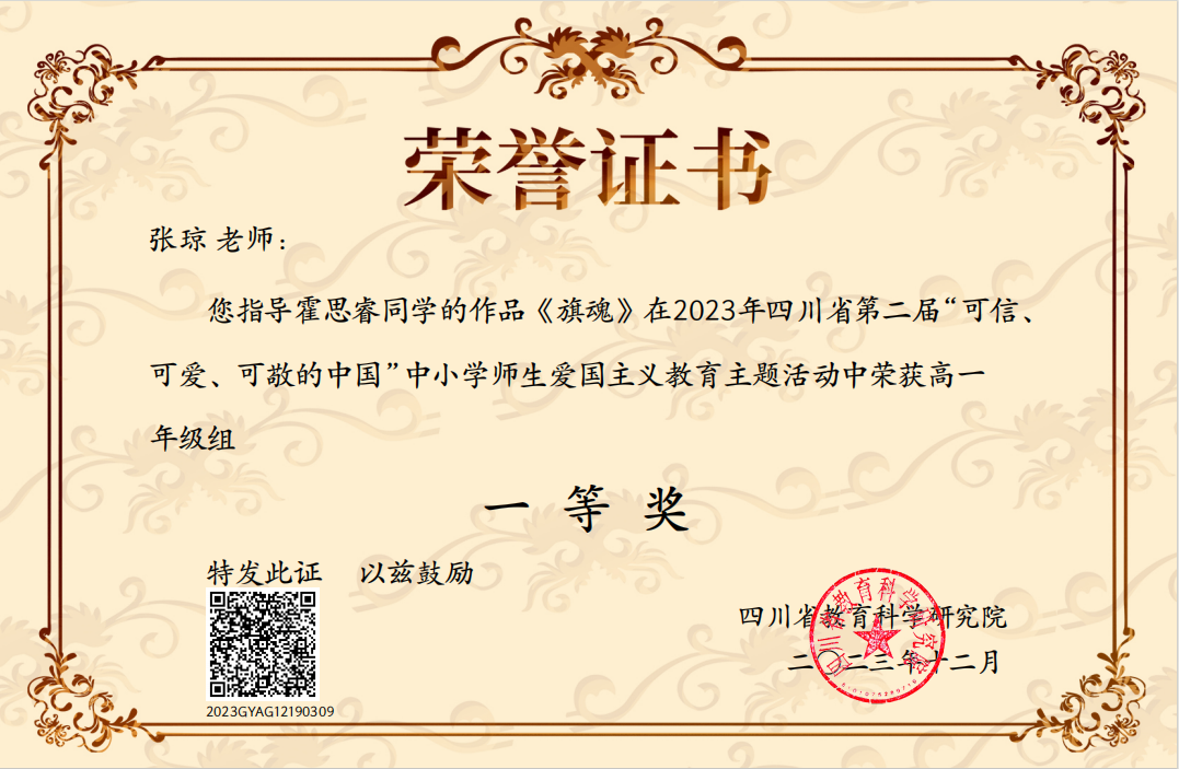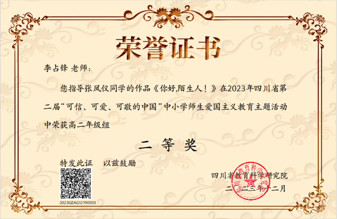 此外,市七中语文教师张琼老师指导霍思睿同学、宋俣同学完成的作品《旗魂》《少年携梦走天下,东方古龙赴远方》分别获得省级一等奖和二等奖,杨雷老师指导朱晓茜同学完成的作品《红巾》、何磊老师指导杨正鑫同学完成的作品《可信、可爱、可敬的中国》、李占锋老师指导盐边分校张凤仪同学完成的作品《你好,陌生人!》均获省级二等奖。