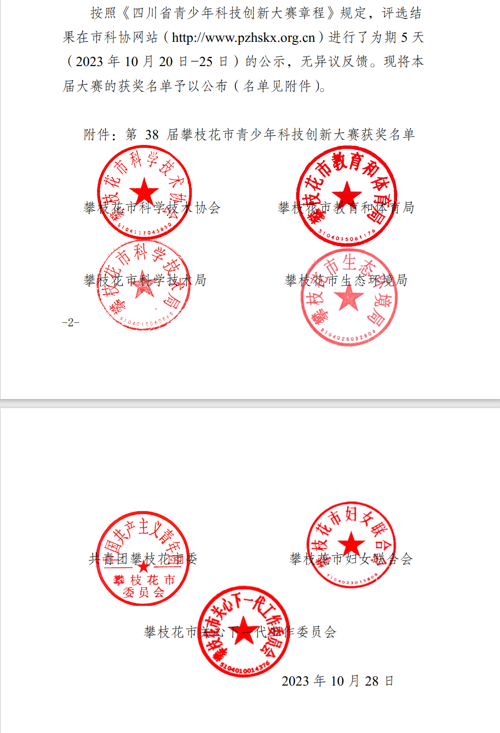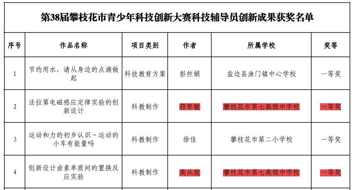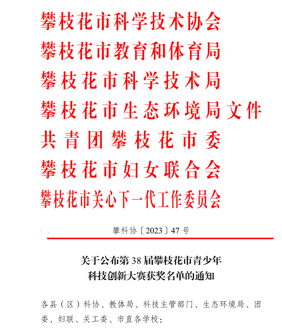 近日,由市科协、市教体局、市科技局、市生态环境局、团市委、市妇联、市关工委共同举办的第38届攀枝花市青少年科技创新大赛落下帷幕,我校师生再创佳绩:荣获科技辅导员创新成果一等奖2项,青少年科技创新成果(中学组)一等奖3项、二等奖2项、三等奖1项,优秀辅导员奖1项。