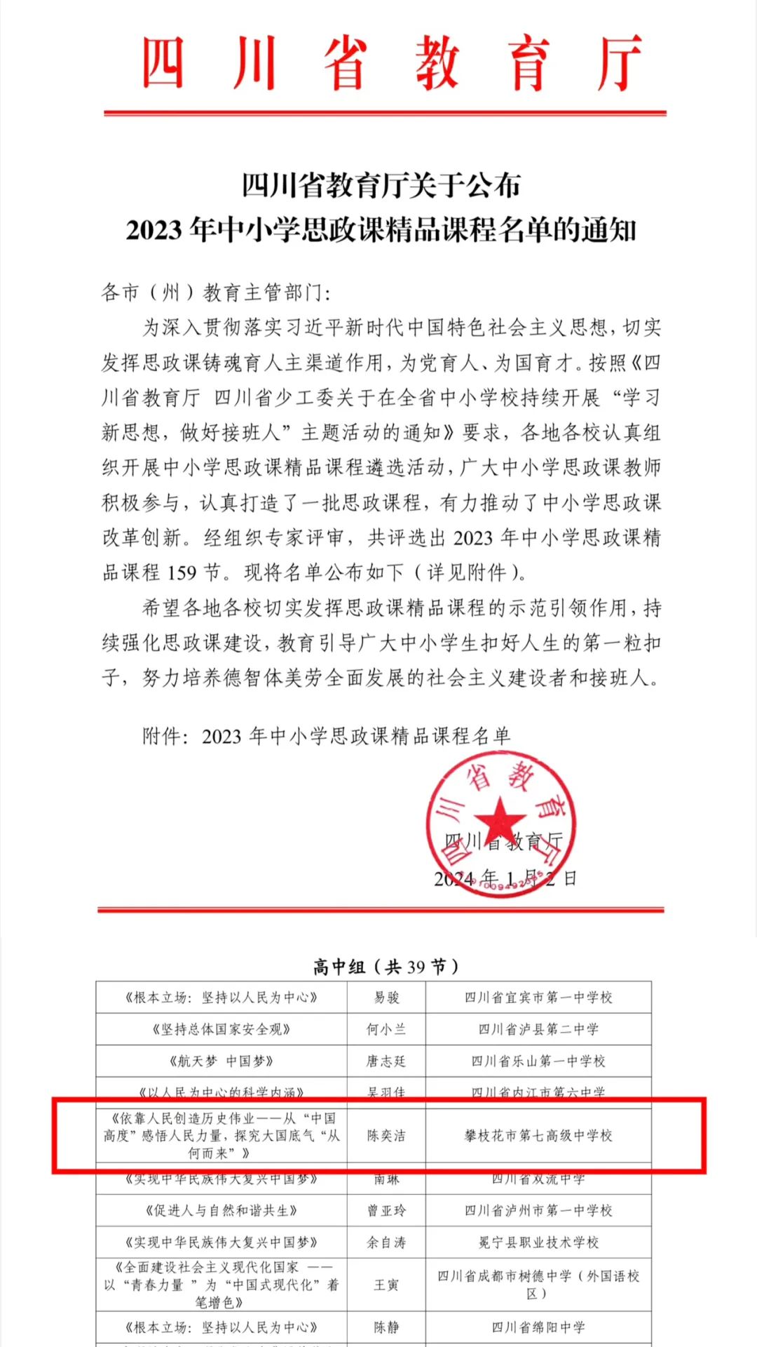 近日,四川省教育厅公布了2023年中小学思政课精品课程名单,经组织专家评审,我校陈奕洁老师的思政课再次入选为四川省中小学思政课精品课程。
