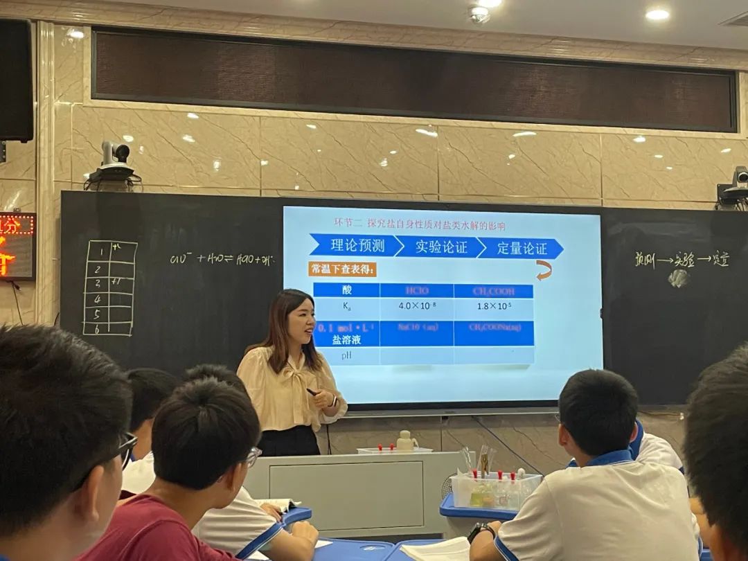 大会从全国参会名师工作室中遴选出七堂优质实验课展示,我校张玉娥老师设计的优质课《影响盐类的水解因素》评选为优质示范课。张老师以“理论预测--实验论证--定量论证”为研究思路,带领学生探究了影响盐类水解的内因和外因,以“我为父母洗烟机”为情景主线,引出化学问题,探究得出结论后再应用其解决洗油烟机的问题,最后将化学知识用于解释钛白粉的生产条件的选择,同时推广介绍攀枝花。整堂课学生气氛热烈,积极互动,获得了全国参会名师工作室的一致好评。