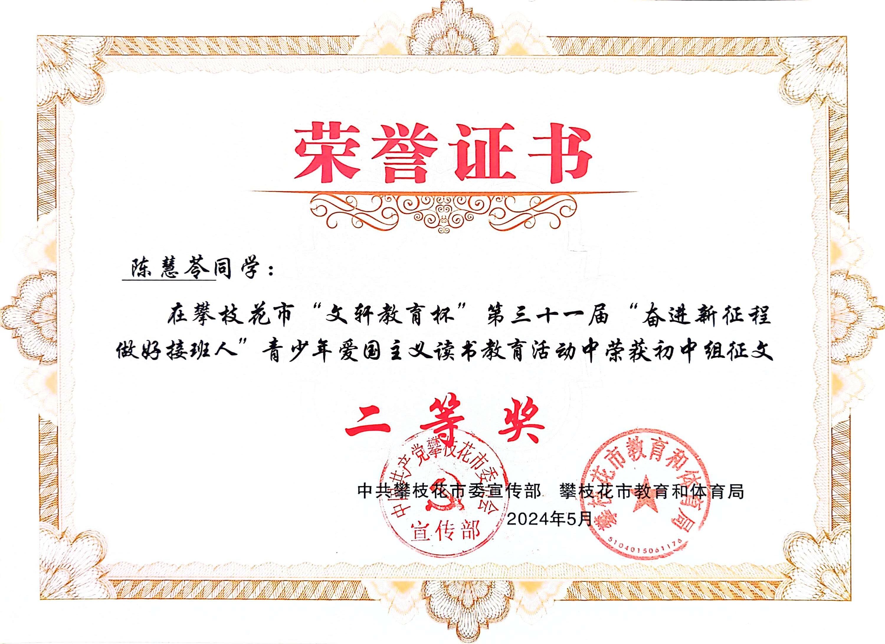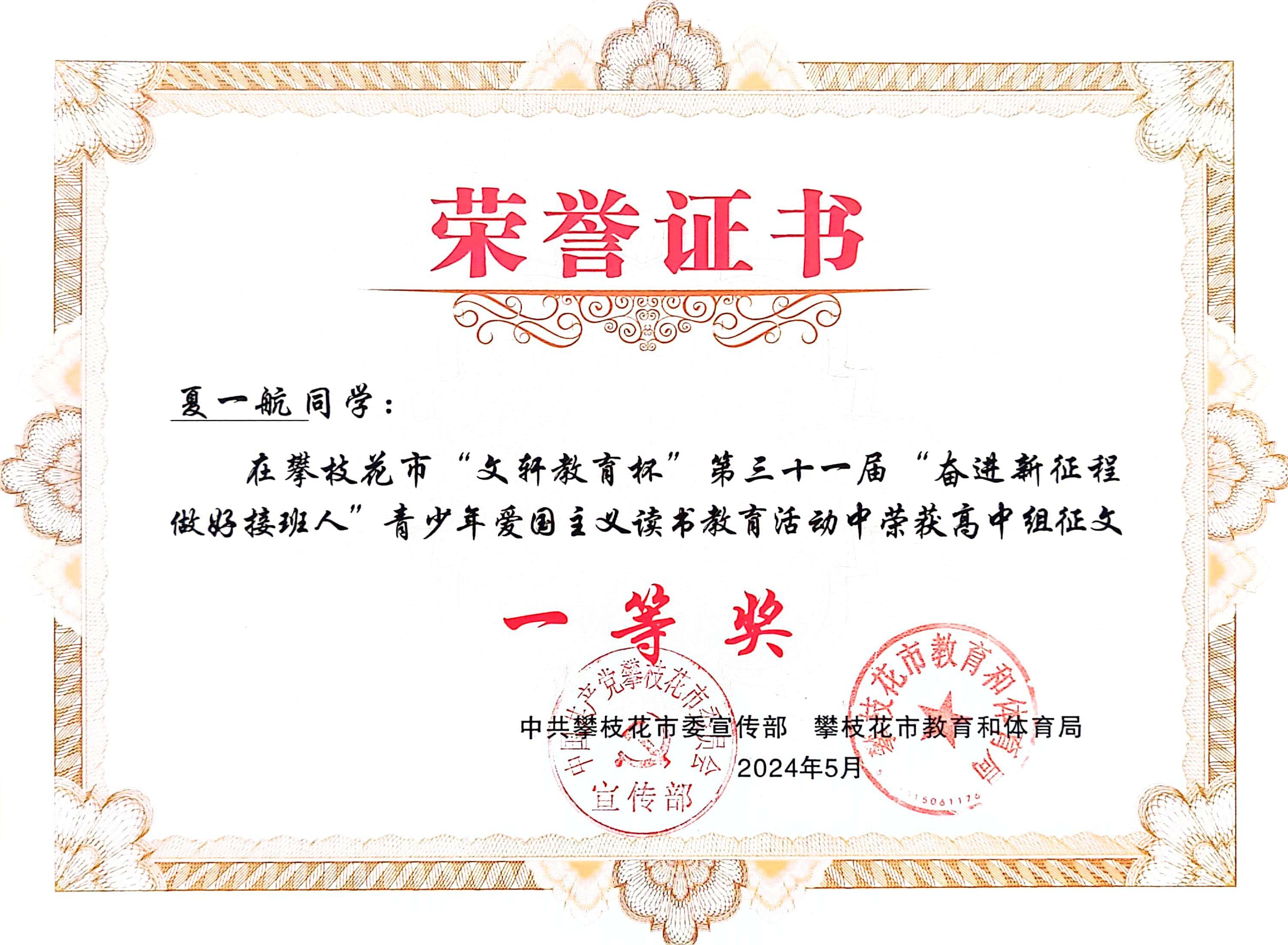 我校学生积极参与,在征文比赛中斩获佳绩。在高中组征文比赛中,夏一航同学荣获一等奖,唐雪家同学荣获二等奖,魏宁同学荣获三等奖。在初中组征文比赛中,陈慧苓同学和张兴莲同学荣获二等奖。