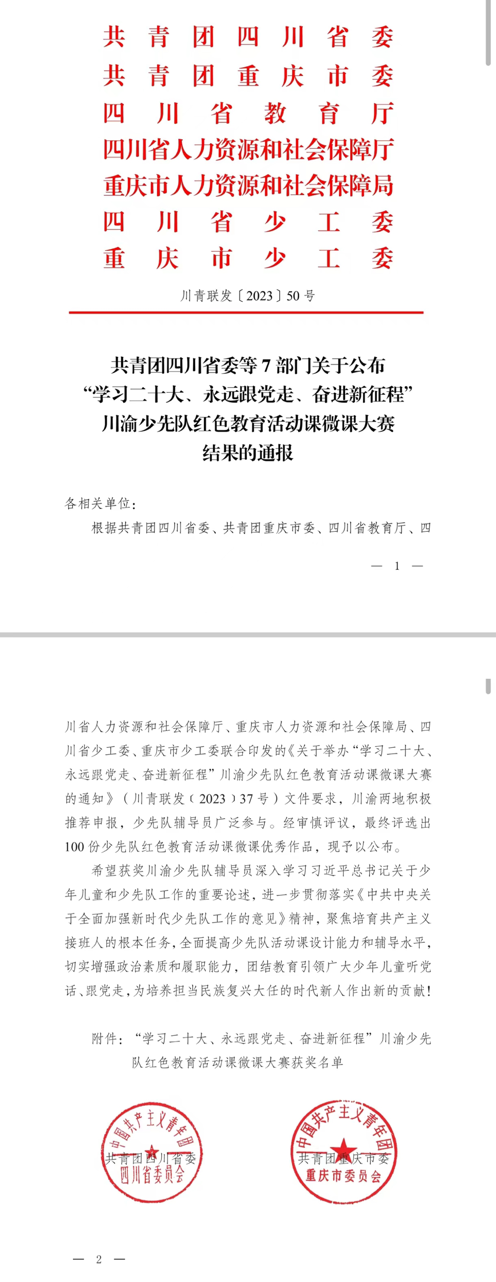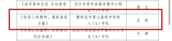 近日,根据《共青团四川省委等 7 部门关于公布“学习二十大、永远跟党走、奋进新征程”川渝少先队红色教育活动课微课大赛结果的通报》,攀枝花市第七高级中学校八(1)中队尤聪老师指导的红色教育活动微课《传承三线精神,激发奋进力量》荣获省一等奖!
