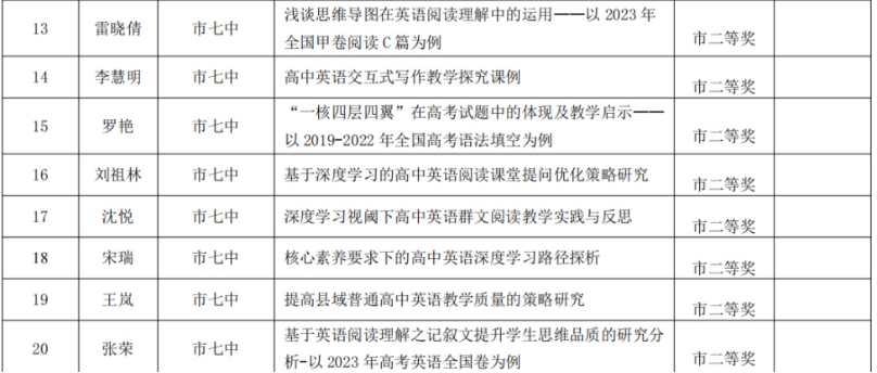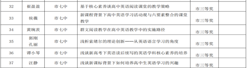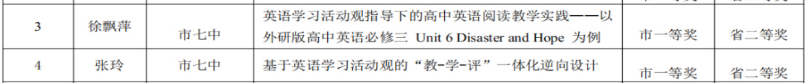 此次比赛为广大英语学科教师搭建了学术研讨平台,有助于提升教师教育教学研究水平。我校教师积极踊跃参加,将自己的一线的教学经验和实践转换成可供交流探讨的理论成果。成果的获得,不仅源于教师个人的辛勤耕耘和深入研究,也离不开学校平台搭建。荣誉是一份鼓励,也是一份鞭策。我们将继续努力,坚守教育初心,不断成长。