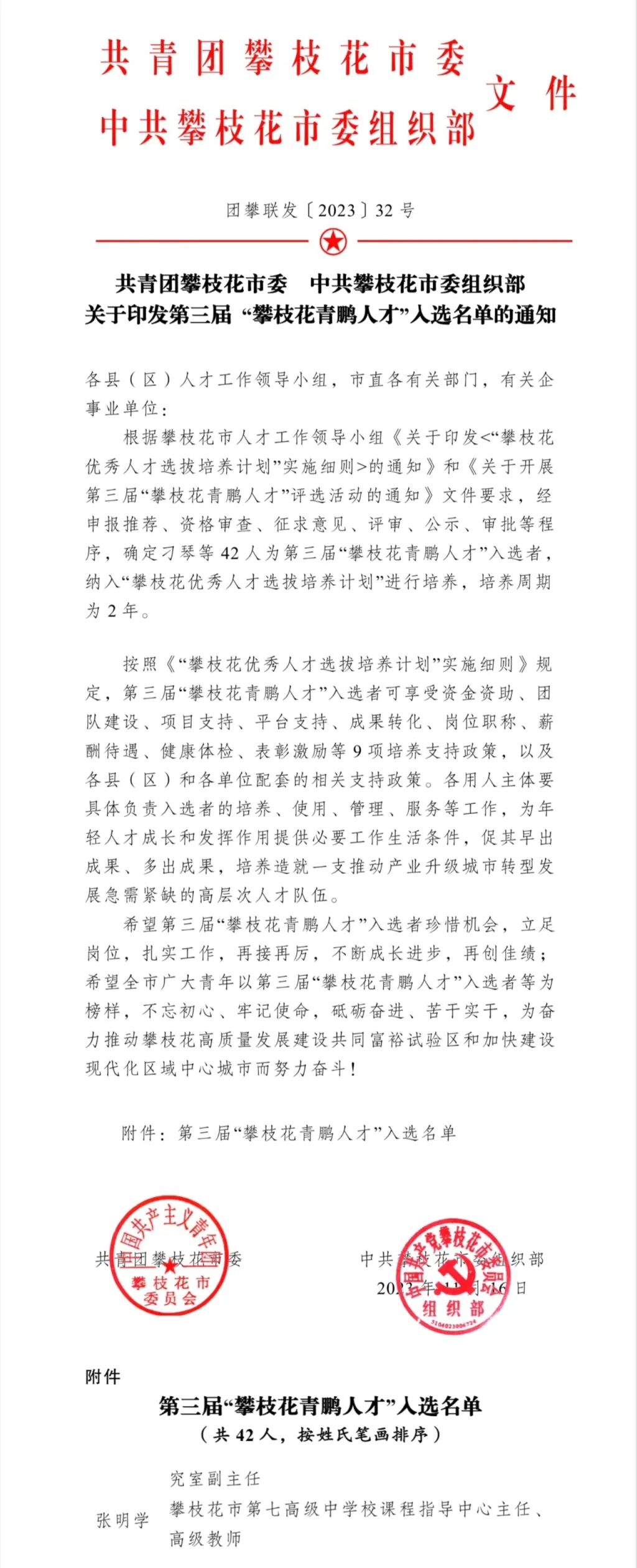 近日,共青团攀枝花市委、市委组织部公布了第三届“攀枝花青鹏人才”入选名单,我校教师张明学成功入选。