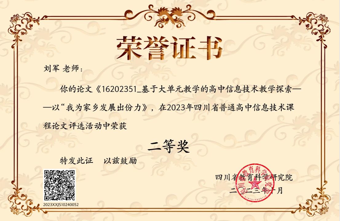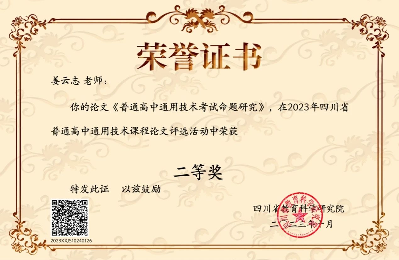 恭喜刘军老师和姜云志老师获得优异的成绩,相信他们的论文将对高中技术教育领域产生积极的推动作用,为更多的教师和学生提供借鉴和启示。攀枝花市第七高级中学校也将进一步加强教研、科研活动,提升教师的专业素养和教学水平,最终为学生成长成才构建更加稳固的平台,提供更加可靠的保障。