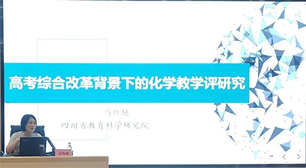 马红艳老师做了题为《高考综合改革背景下的化学教学评研究》的专题讲座,她从高考综合改革情况、高考典型试题分析和教学备考行动策略三个方面阐述了高考试题命制的核心立意和依据,分享了培养创新性、探索性拔尖人才教学的方法和策略。