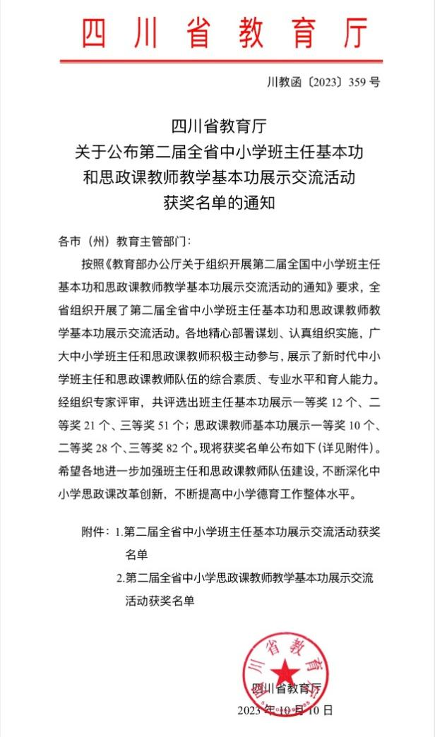近日,由四川省教育厅举办的第二届全省中小学班主任基本功和思政课教师教学基本功展示交流活动评奖结果揭晓,我校陈奕洁老师凭借优异表现荣获全省二等奖。