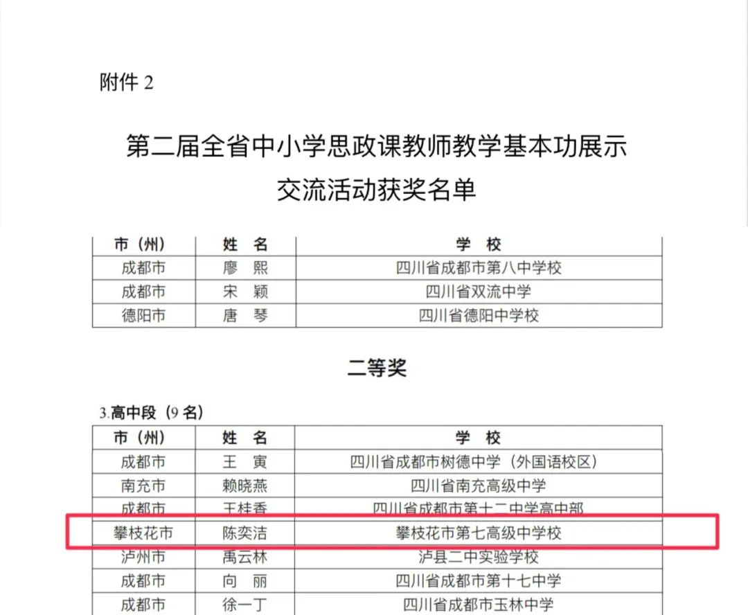 本次比赛,来自全省21个地市州的众多学校积极参加,陈奕洁老师荣获攀枝花市第四届思政课教师教学基本功展示第一名,代表攀枝花市参加省赛。在层层遴选推荐上报的数百份参赛材料中,由省教厅组织的专家精心评审后,高中组全省评出一等奖3人,二等奖9人。本次比赛的典型经验和案例将在四川省教育公共资源平台上进行展示推广,这也是攀枝花本赛事所有参赛选手获得的唯一一个二等奖。