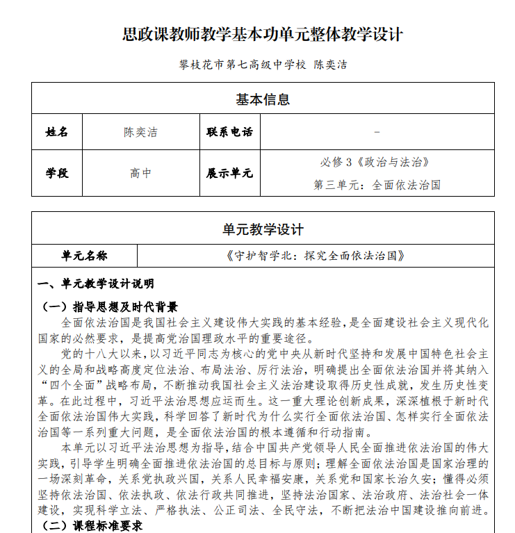 大单元教学设计部分,陈奕洁老师以市七中所在的“智学北路”为背景依托,以“守护智学北”为主题,围绕学生不同日常生活情境共设置包括综合探究在内10个课时:从横向角度围绕“从哪来”、“到哪去”的问题以及推进全面依法治国的“全过程”,整合为中国共产党百年法治历程的延伸以及全面推进依法治国的基本要求;从纵向“全层次”的角度围绕“是什么”和“怎么做”的基本探究逻辑,整合法治中国建设的相应内容。