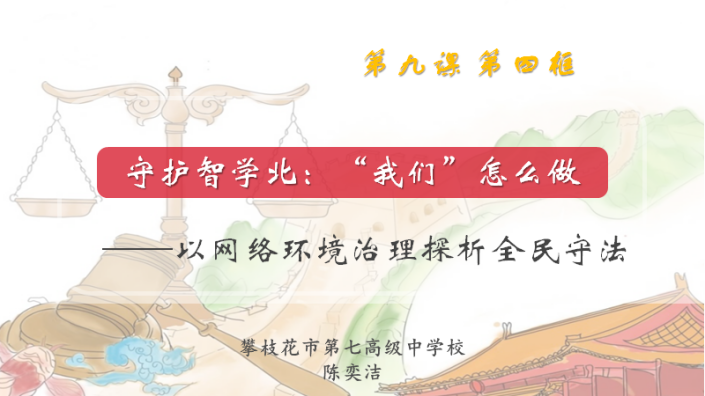 课堂展示中,陈老师设定“以网络环境治理探析全民守法“为总议题,下设三个子议题:“知法懂法,认识全民守法”、“普法践法,助推全民守法”、“尊法崇法,凝聚法治共识”分别就全民守法的内涵和推进展开教学。课程设计时着重采用辨析式学习方法,通过设置情境、举行辩论赛、小组探讨《智学北网络环境规范公约》草案等形式,带领学生围绕特定的议题,借助相关情境,运用学科知识,发挥学科思维,在自主思考的基础上,通过比较、鉴别、分析、评价、论证等方式获得本节课相关知识储备,由此提升学生辩证思维能力,培养学生科学精神。活动开展效果良好,课堂氛围活跃。